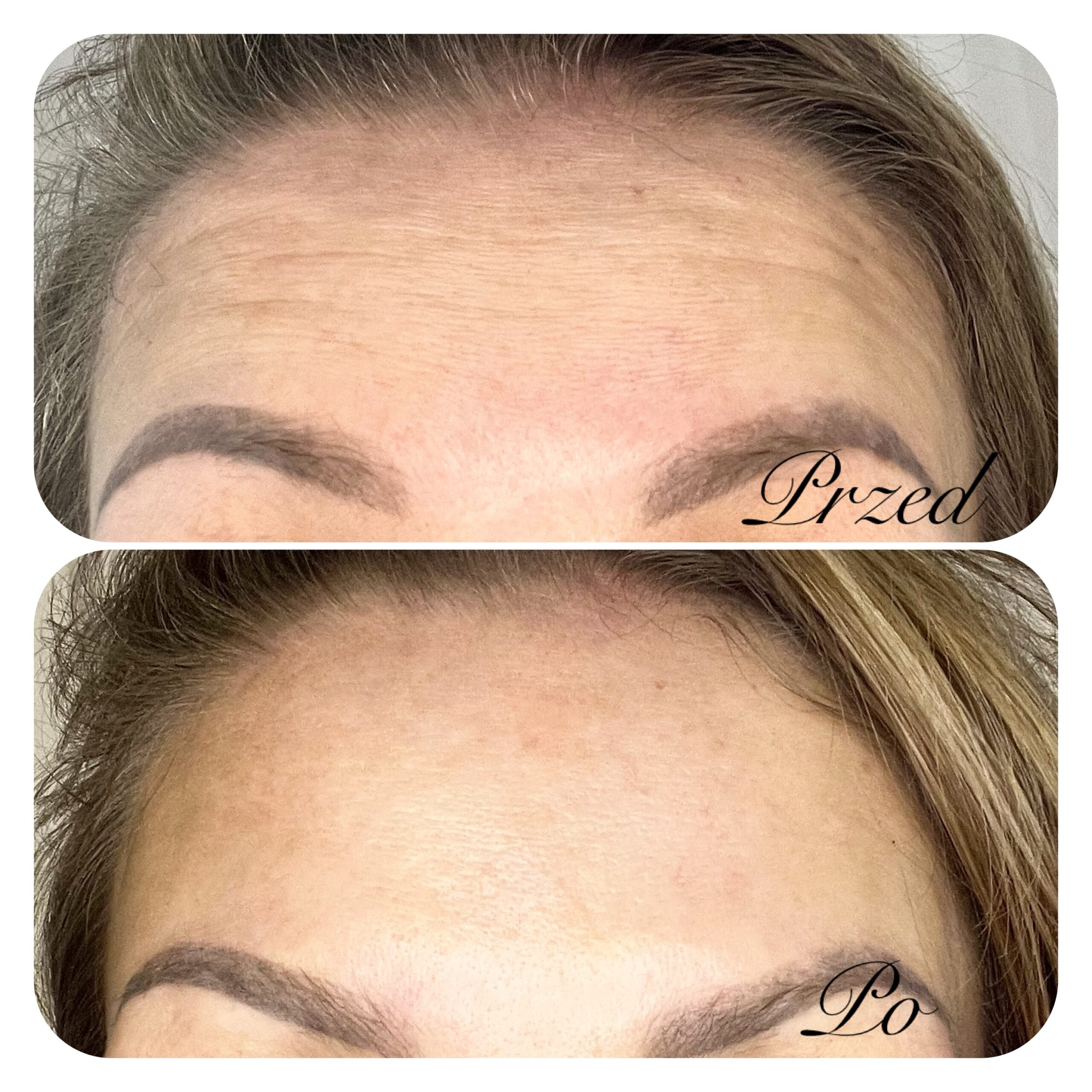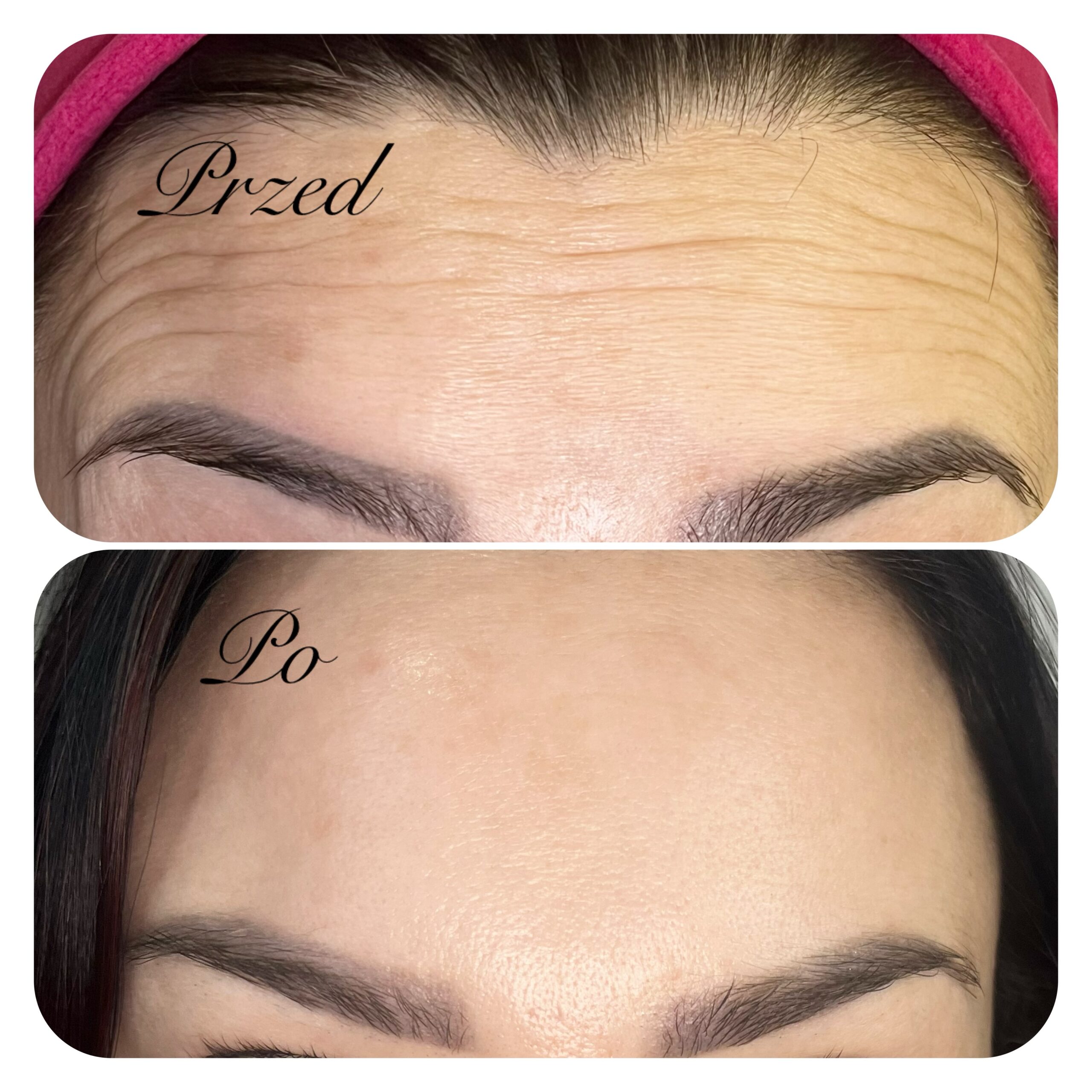 Zabieg z użyciem toksyny botulinowej na zmarszczki poprzeczne czoła. Efekt uzyskany po 2 tygodniach od zabiegu.