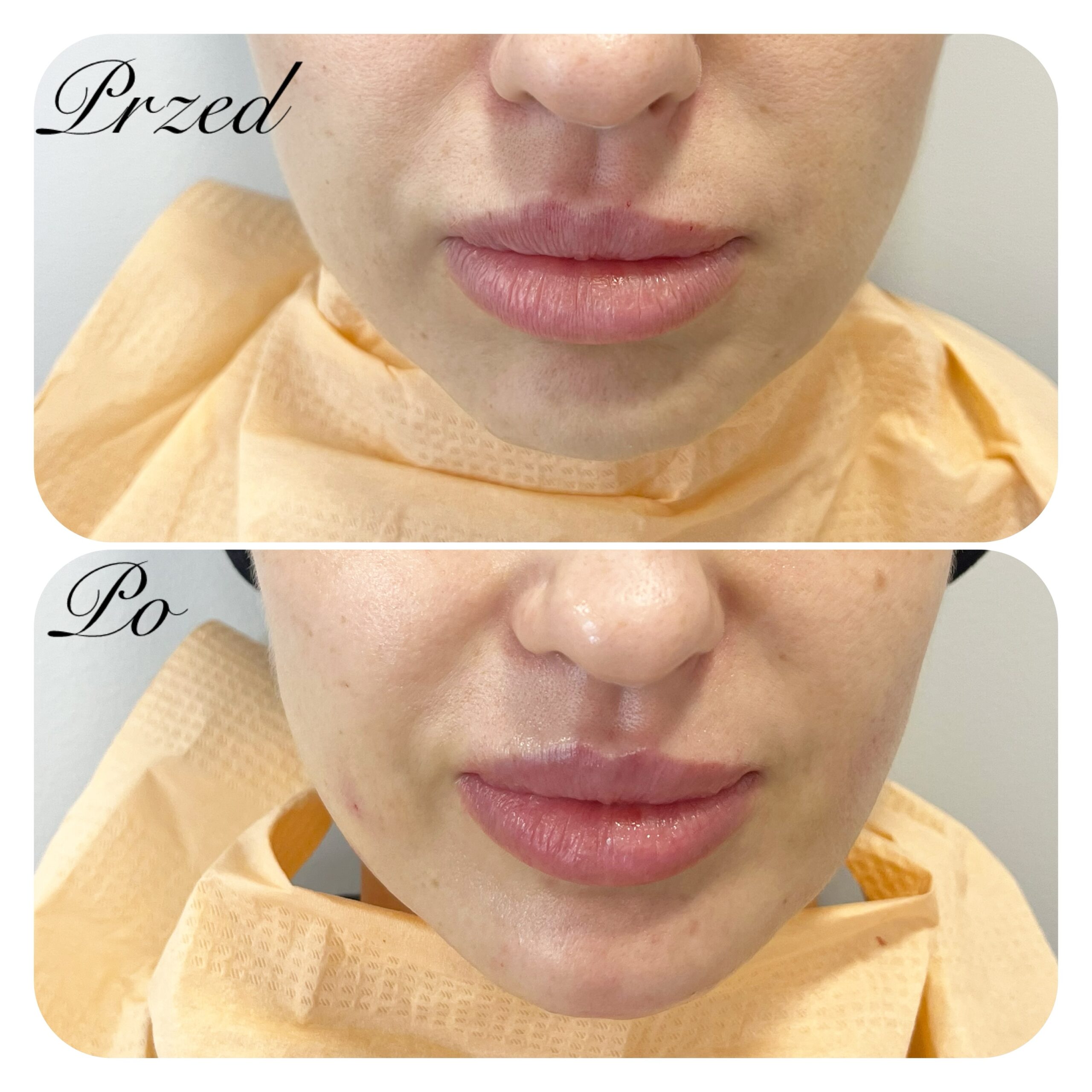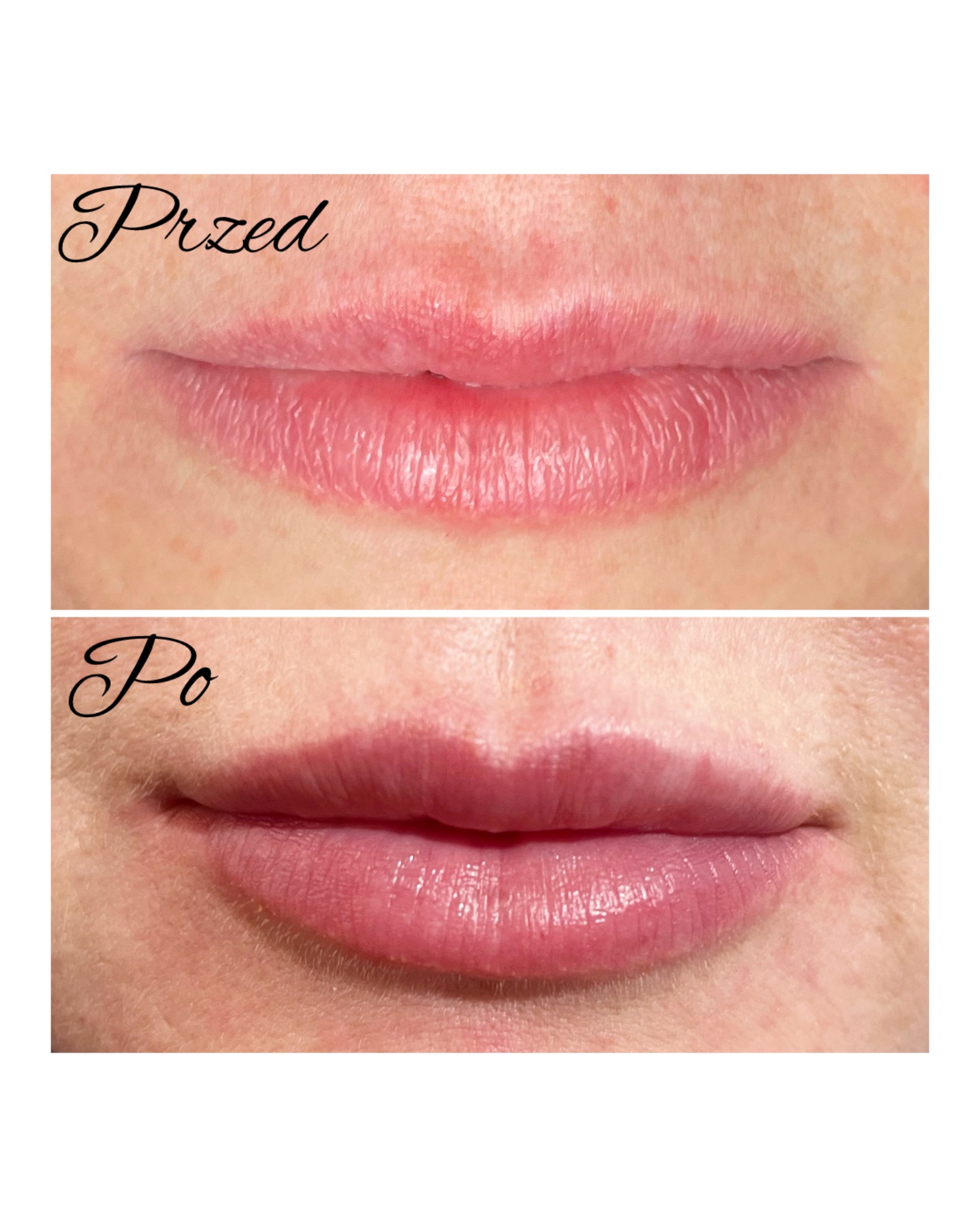 Zabieg powiększania czerwieni wargowej z użyciem preparatu kwasu hialuronowego. Efekt 2 tygodnie po zabiegu.
